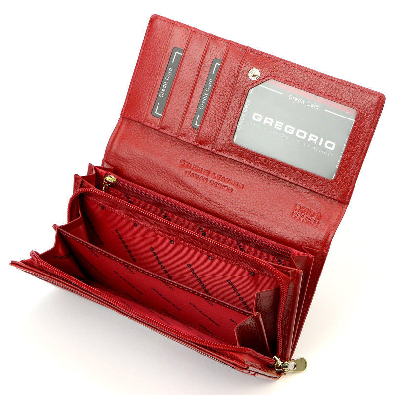 Má 2 přihrádky na bankovky a jednu kapsičku se zipem, dále 2 na kovové mince, rovněž se zapínáním na zip. Dále je uvnitř dámské peněženky 9 přihrádek vhodných například na kreditní kartu, velká kapsička na řidičský, občanský a jiný průkaz.