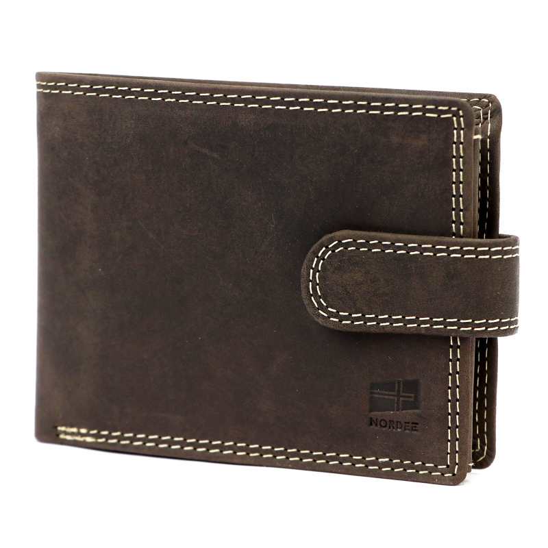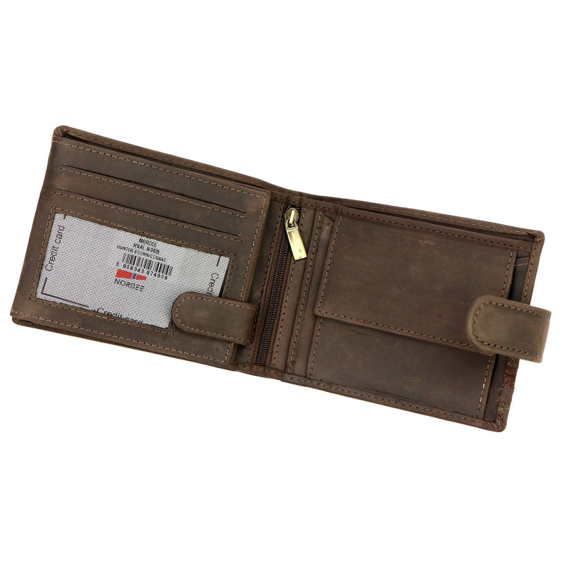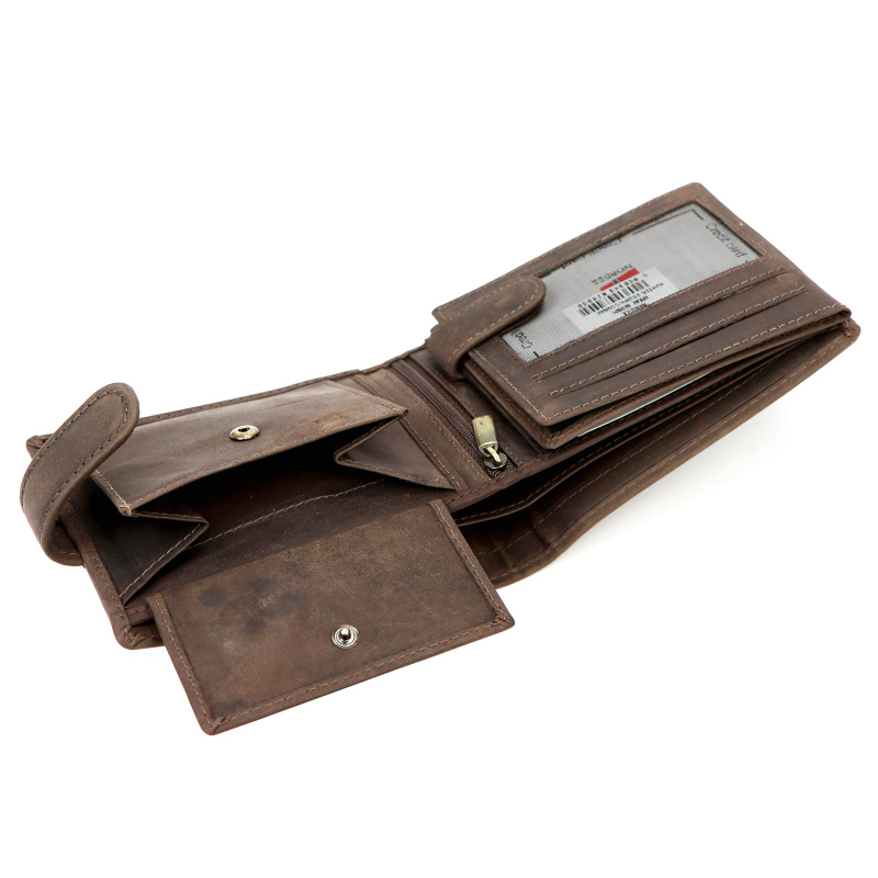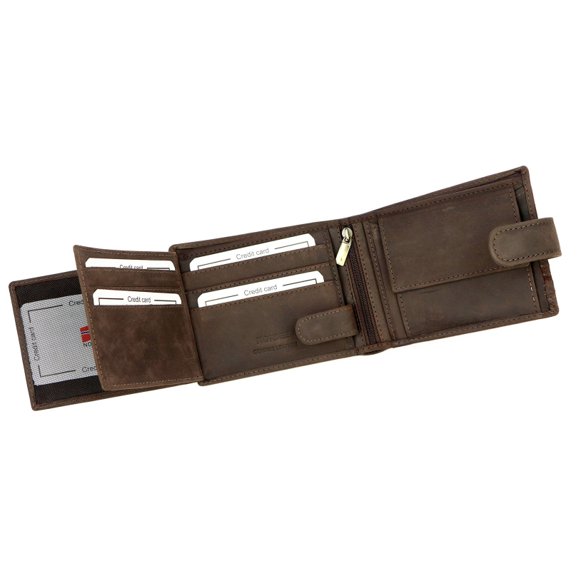 Kvalitní pánská peněženka v barvě hnědé kůže, má 2 přihrádky na bankovky a jednu na kovové mince. Dále je uvnitř pánské peněženky 8 přihrádek vhodných na karty a 5 větších kapes na technický průkaz, nebo jiné doklady. Aby bylo možno sladit celkový vzhled, lze k peněžence také zakoupit hnědý pásek a pánskou tašku.