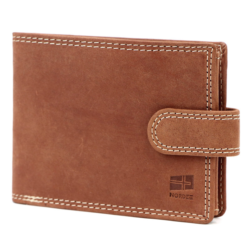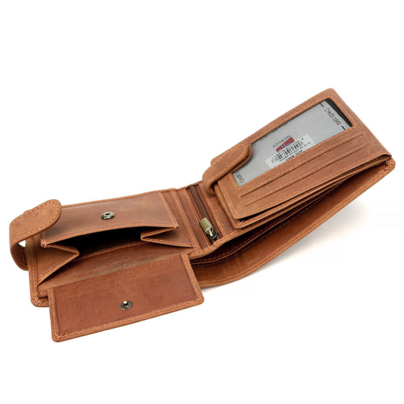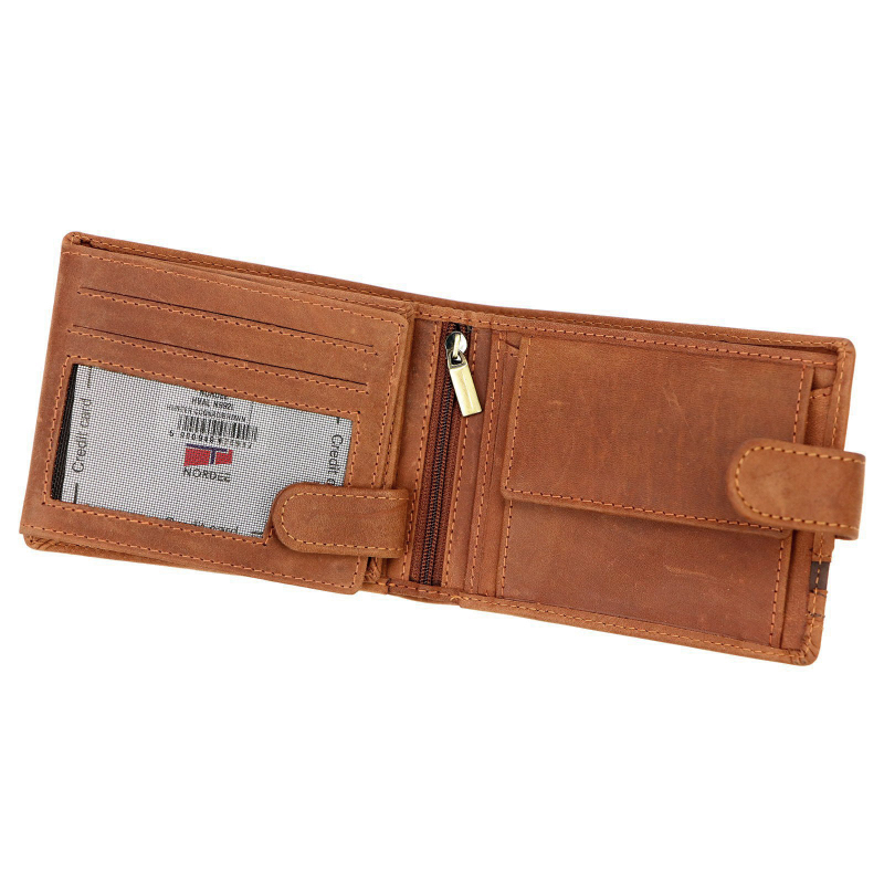 Kvalitní pánská peněženka v barvě světle hnědé kůže, má 2 přihrádky na bankovky a jednu na kovové mince. Dále je uvnitř pánské peněženky 8 přihrádek vhodných na karty a 5 větších kapes na technický průkaz, nebo jiné doklady. Aby bylo možno sladit celkový vzhled, lze k peněžence také zakoupit hnědý pásek a pánskou tašku.