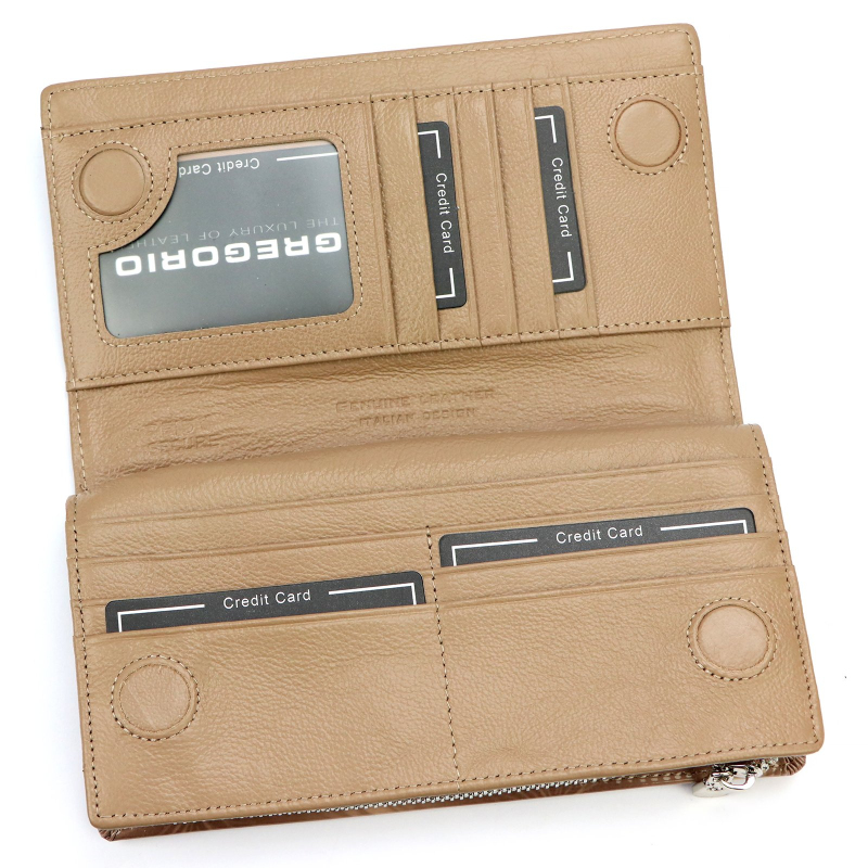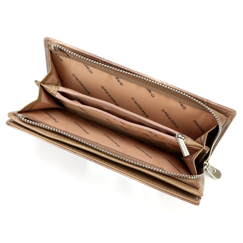Uvnitř dámské peněženky najdeme 2 samostatné přihrádky na bankovky a jednu kapsu na kovové mince se zipem. Dále má peněženka 10 přihrádek vhodných například na kreditní kartu a dvě vetší kapsy na doklady, účtenky a jiné drobnosti.