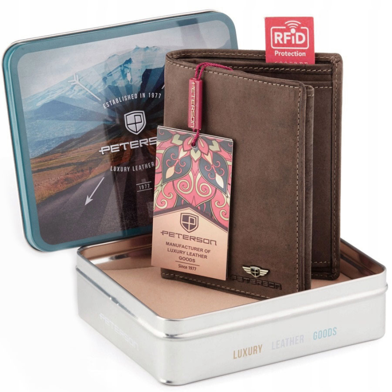 Kvalitní hnědá pánská peněženka je vyrobená z broušené přírodní kůže a zdobí ji logo a jméno značky Peterson. Peněženka je prostorná, má 2 přihrádky na bankovky a jednu na kovové mince, 10 slotů na karty a 4 větší kapsy na technický průkaz, nebo jiný doklad a kapsičku se zipsem. Součástí balení je krásná dárková krabička.
