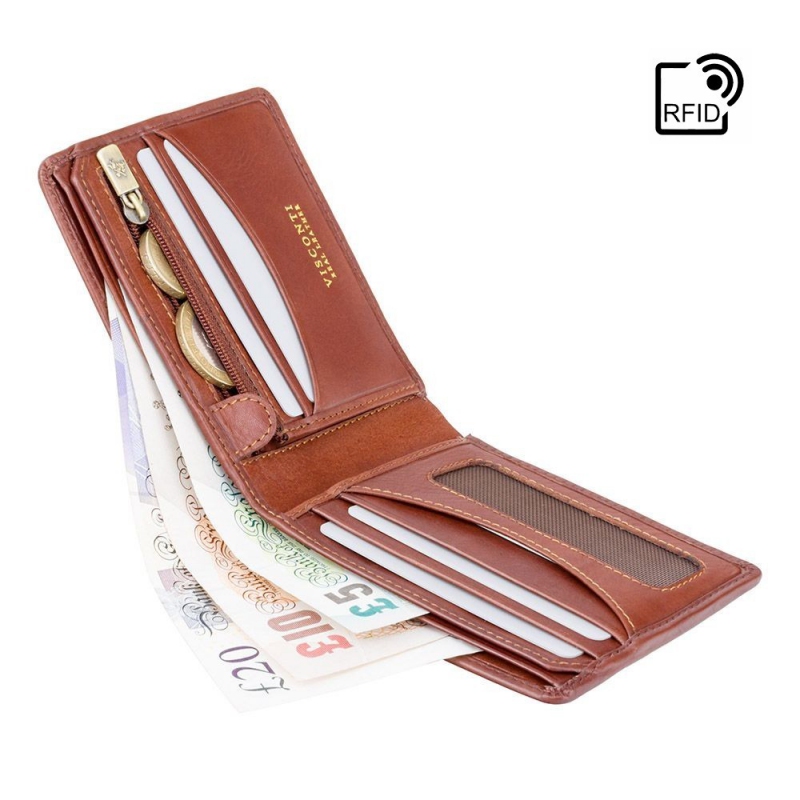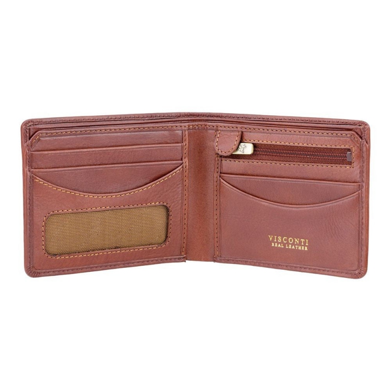 Značková pánská kožená peněženka Visconti se vyznačuje na omak příjemnou měkkou prémiovou přírodní kůží, kvalitním ručním prošitím a značkovou podšívkou se znaky Visconti. Peněženka má 2 přihrádky na papírové bankovky vhodné pro české i zahraniční měny, jednu kapsičku na kovové mince, 5 slotů na karty a vetší průhledný slot na osobní doklady. Součástí balení je i dárková krabička na pánskou peněženku.